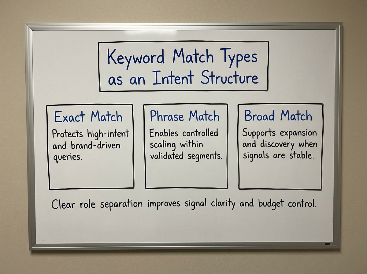Each match type plays a different role in the account. Broad match supports expansion and discovery. Phrase match enables controlled scaling. Exact match protects high-intent and high-value queries.