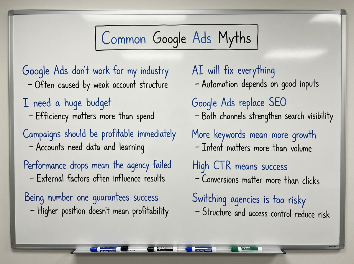 Most Google Ads myths and misconceptions persist because they simplify a system that’s inherently strategic. When campaigns underperform, it’s tempting to blame the platform, the budget, or the competition. In reality, results usually reflect how well the account is structured, managed, and aligned with the business model and conversion signals.