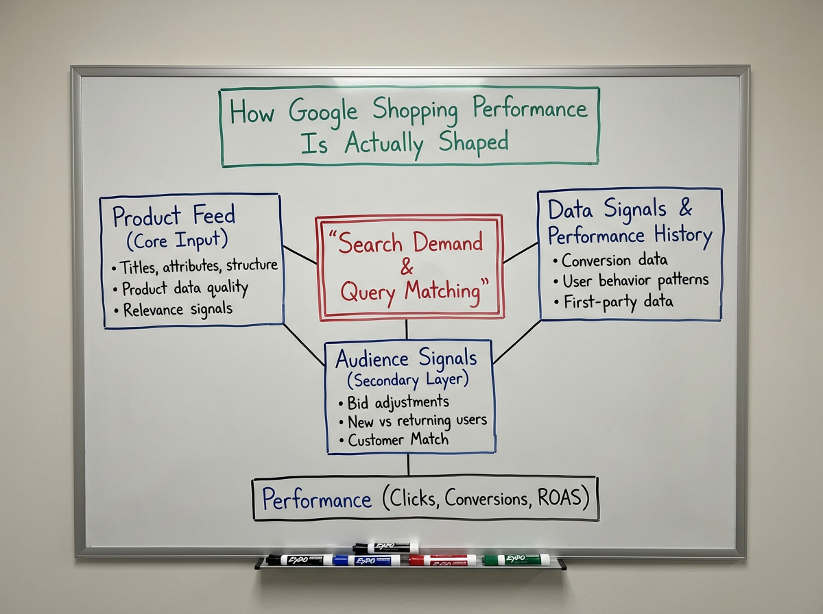 But Google Shopping operates differently. In Shopping, performance is not primarily driven by who you target, but by how well your products match existing demand. Audience signals still play a role, but they do not define targeting in the traditional sense. They influence bidding aggression, not who the ads are shown to.